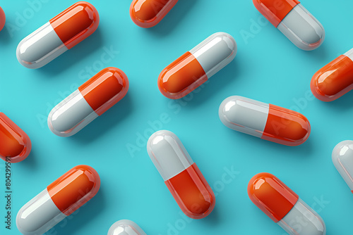 White and red pills arranged in rows on a blue background, pattern, 3D illustration