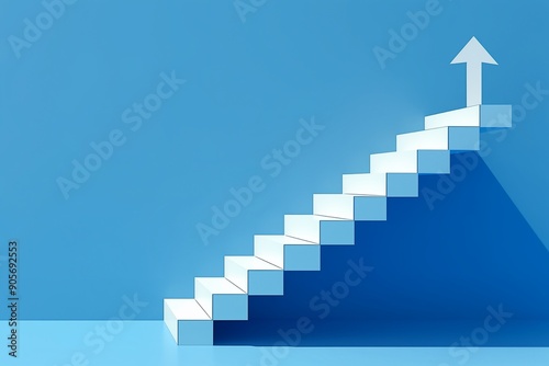 White arrow up blue stairs on blue background, 3d arrow climbing up stairs