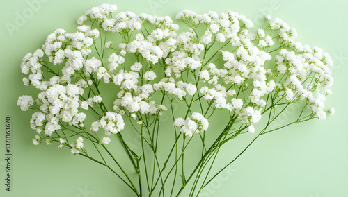 "White Baby’s Breath Flowers on Pastel Green Background – Elegant Gypsophila Floral Arrangement"