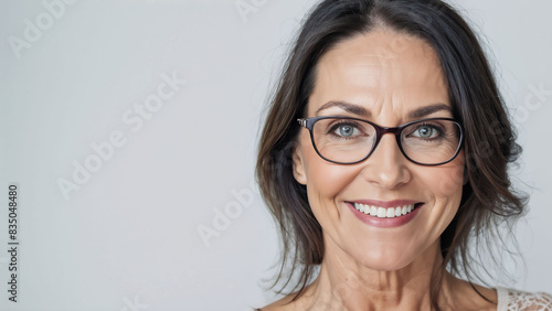 white background, copy space. a woman wearing glasses and a smile with a white background.