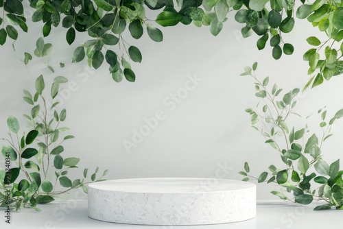 White background for product presentation with white concrete stone round podium, plants and leaves. Mock up scene for cosmetic products, marketing, advertising , product photography