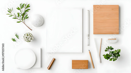 White background stationery mockup; wood, plants, minimalist design; branding template.