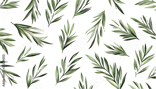 White background vector of slender green needle-like leaves in flat lay.