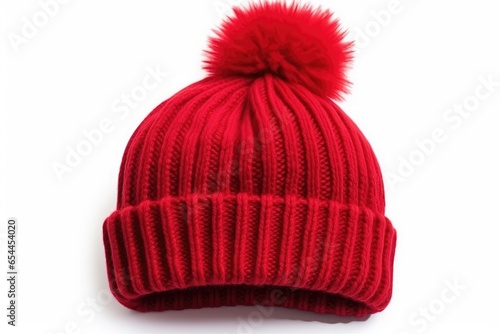 White background with isolated red knit wool hat and pom pom