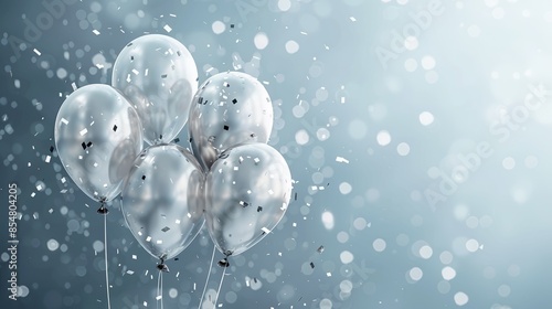 White balloons with silver confetti floating against a soft blue background, perfect for celebrating special occasions.