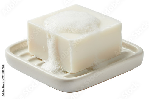 White bar of soap with lather in a matching ceramic soap dish isolated on a transparent background