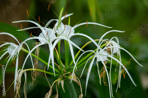 White beach spider lily flower in the garden, Close up & Macro shot, Selective focus