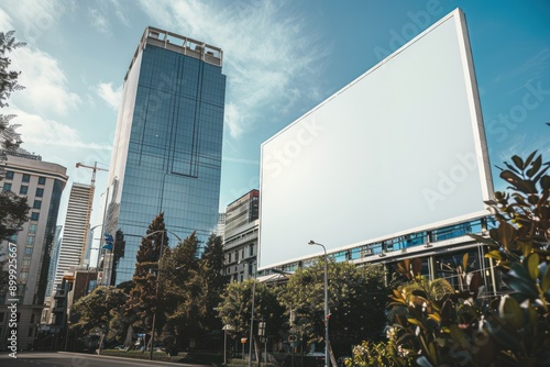 White billboard in a cityscape, urban setting, sunny day, perfect for marketing mockups
