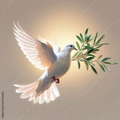 White Bird Holding Olive Branch Against Soft Golden Glow of Sunlight and Sky featuring Graceful Flight of Bird in Nature's Embrace Of Beauty and Serenity. Symbolic Representation of Peace and