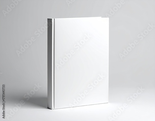 White, blank book standing upright against a plain backdrop