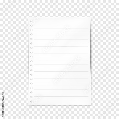 White blank lined A4 hole punched filler paper sheet for ring bound notebook on transparent background. Vector mock-up