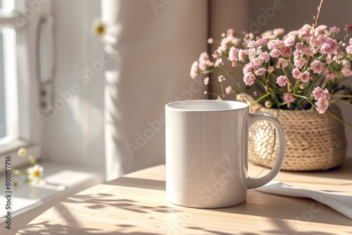 White Blank Mug Mockup in Photographic Scene created with Generative AI