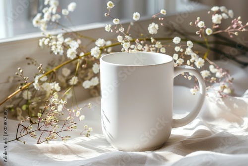 White Blank Mug Mockup in Photographic Scene created with Generative AI