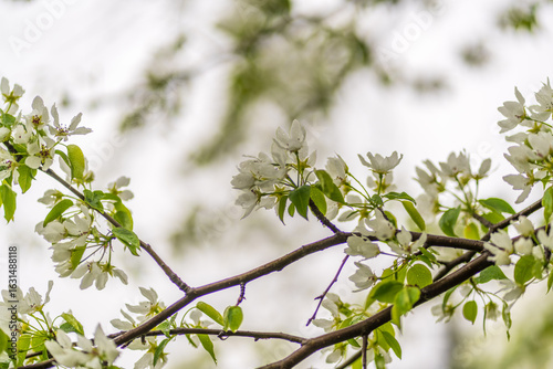 White blossoming apple trees with rain drops