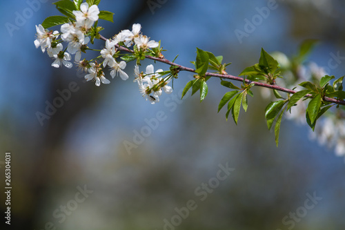 White blossomings on apple-tree branches in sunny and spring day in a garden. Fruit-tree. Small flowers. Background.