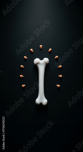 White bone surrounded by small orange skulls on dark background, creating a symbolic image of mortality or memento mori concept