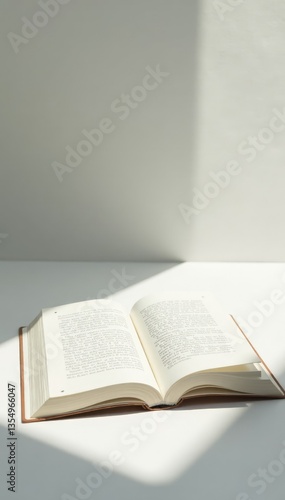 White book open on a pristine white table with natural shadow, elegant, natural light, quiet space