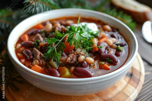 White bowl is filled with steaming bean soup, with beef, beans, and vegetables