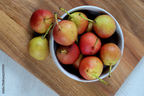 White bowl with small pears on wooden board