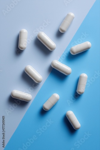 White capsules on blue and light blue background - medical and pharmaceutical concept