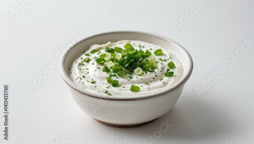 White ceramic bowl filled with herb-infused sour cream dip sauce against a white backdrop