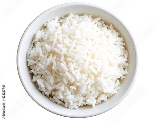 White ceramic bowl filled with steamed rice, top view, isolated on transparent background