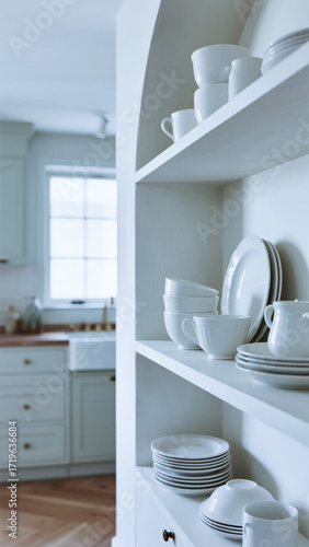White ceramic dishes neatly arranged on open shelving in a bright kitchen