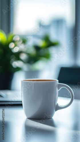White ceramic mug on bright office desk with green plant in natural daylight. Minimalist interior style, morning beverage concept, and branding mockup template with copy space for design.