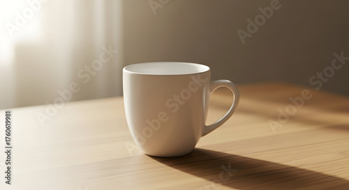White Ceramic Mug on Wood Table with Soft Natural Lighting