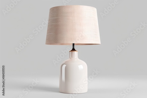 White ceramic table lamp with beige linen shade, simple and elegant style, black metal base, high resolution, hyper realistic