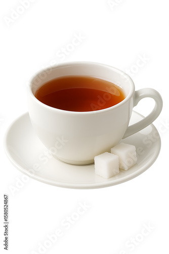 White ceramic tea cup with sugar cubes isolated on transparent background