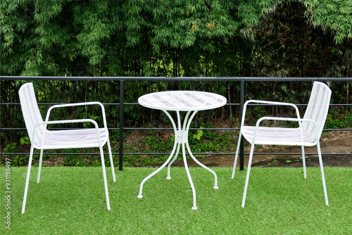 white chairs and table in lawn of garden
