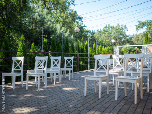 White chairs are arranged on a brick patio with a white runner in the center, surrounded by trees and a white gazebo
