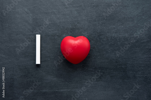 White chalk with red heart shape ball on blackboard background