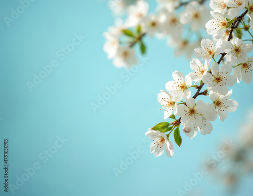 White cherry blossoms bloom on tree branches against a clear blue sky. Delicate petals and green leaves appear in bright spring sunlight. Copy space available for text.