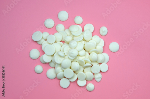 White chocolate drops on a pink background. White drops of chocolate for making icing. White chocolate for confectioners top view.