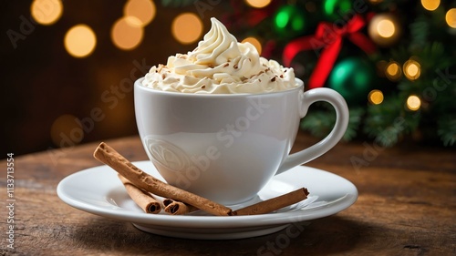 white chocolate mocha served on a wooden table with Christmas theme
