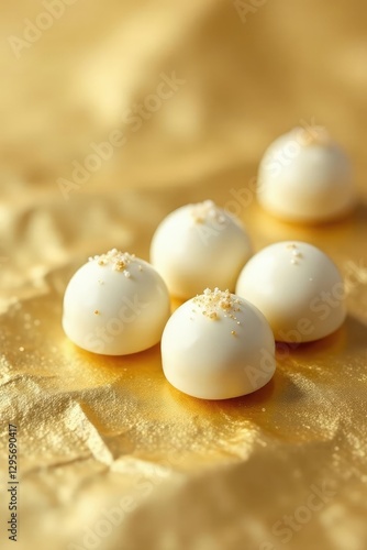 White chocolate truffles on a gold leaf background, velvet, elegant
