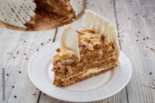 White Chocolate vegane cake with nuts and cream. Birthday concept