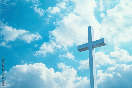 White Christian Cross Against a Bright Blue Cloudy Sky Scenery
