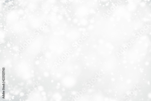 White Christmas abstract bokeh background with snowflake and silver glittering bokeh stars. Festive Glowing blurred lights.