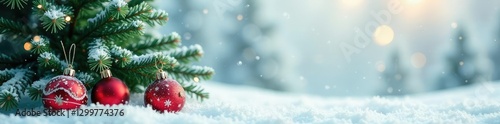 White Christmas scene with green fir tree and ornaments, peaceful, frost