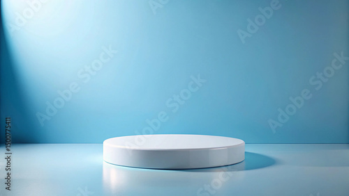 White circular podium on a light blue background with soft light