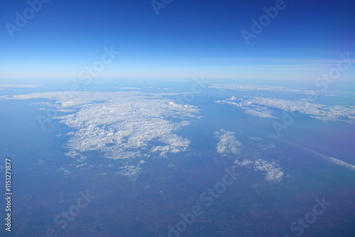 White clouds drift across the stratosphere against a blue sky. A few clouds dot the otherwise brilliant and pure sky. As if gazing up at a picturesque day, the scene is calm and tranquil.