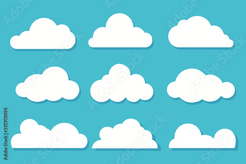 White clouds flat design set on blue sky background. Vector illustration
