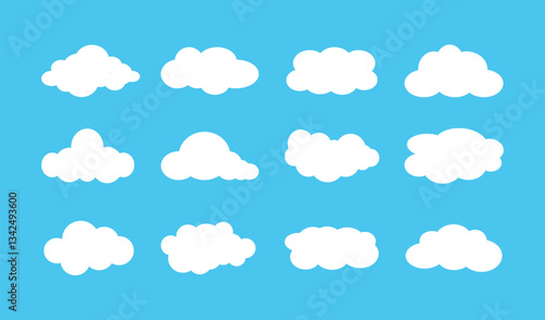 White clouds flat icons collection. Abstract simple cartoon clouds and blue sky.