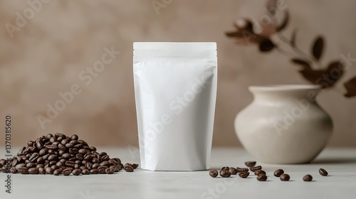 White Coffee Bag with Coffee Beans and Minimalist Vase on Neutral Surface in Stylish Kitchen Setting