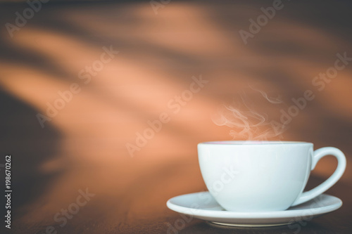 White coffee cup on wooden table or counter in coffee shop and blur light bokeh background