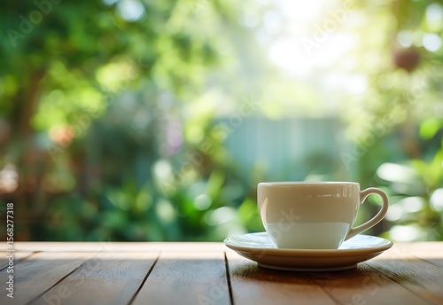 white coffee mug on an old wooden table with a blurred background
