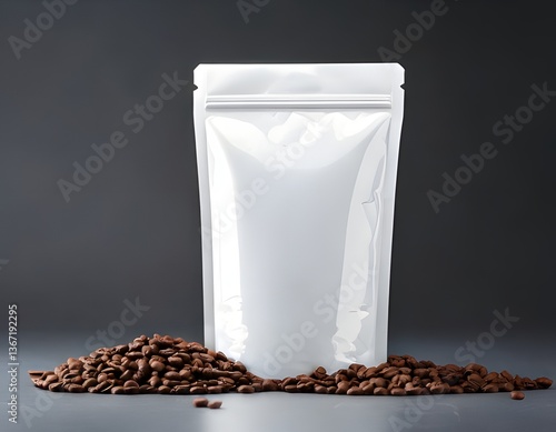 White coffee pouch with blank packaging surrounded by coffee beans, product mockup, branding concept, coffee industry, food packaging design, e-commerce product display, advertising template
